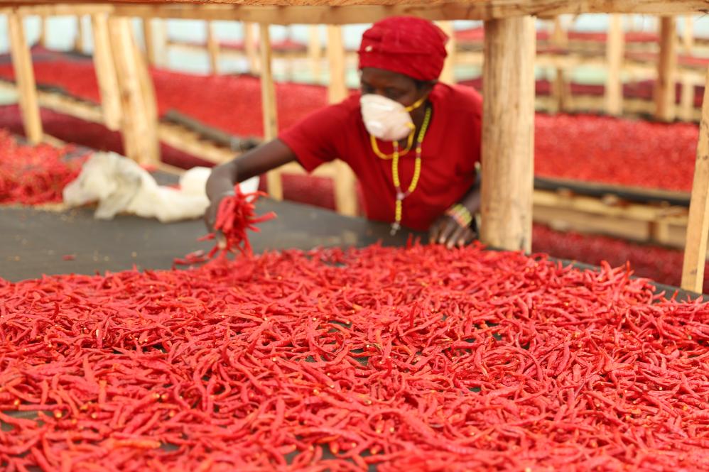 5月22日,工人在卢旺达东方省恩亚加塔雷地区筛选辣椒。(图片来源:新华社)